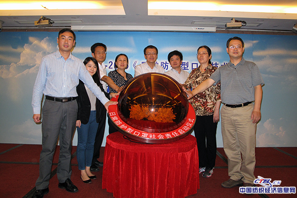 在宣贯培训会现场,中国产业用纺织品行业协会李陵申会长、国家标准化管理委员会工业标准二部副主任王莉、工业和信息化部消费品工业司处长曹庭瑞、国家劳动保护用品质量监督检验中心杨文芬主任、京东商城肖迪经理以及上海兴诺康纶科技股份有限公司赵丹青董事长、稳健集团代碧新副总监共同按下口罩行业社会责任誓师仪式的启动球。宣誓由政府、协会、检测机构、生产企业、商贸平台携手向社会承诺,汇聚社会各界的力量,形成“政府支持、协会引导、企业实施、检测保障、市场推动”的完善体系,推动和引领生产企业积极履行本行业的社会责任,让消费者安心使用口罩。